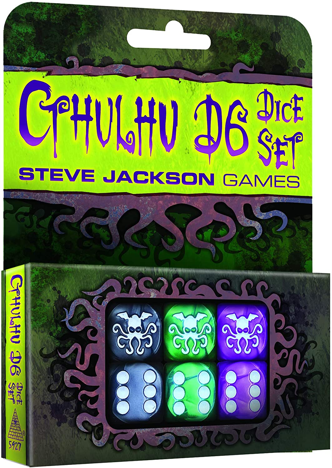 Εκπληκτικά ζάρια για χρήση με κάθε παιχνίδι που απαιτεί D6! Αυτά τα όμορφα ζάρια 19 χιλιοστών διαθέτουν περλέ φινίρισμα, λευκά κουκούτσια και το εικονίδιο Cthulhu στη θέση του ενός κουκούτσι. Αυτό το σετ περιέχει δύο μωβ, δύο πράσινα και δύο μαύρα ζάρια και μπορούν να χρησιμοποιηθούν για να προσθέσετε τον τρόμο Eldritch στα παιχνίδια σας!