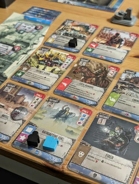 In this card based game, players control one of eight factions — Mutants Union, Merchants Guild, Appalachian Federation, New York, University, Mississippi, Texas or Hegemony — and try to build their own new State. Players put new locations into the game, hire leaders, and send people to work in buildings to gain resources and new skills.