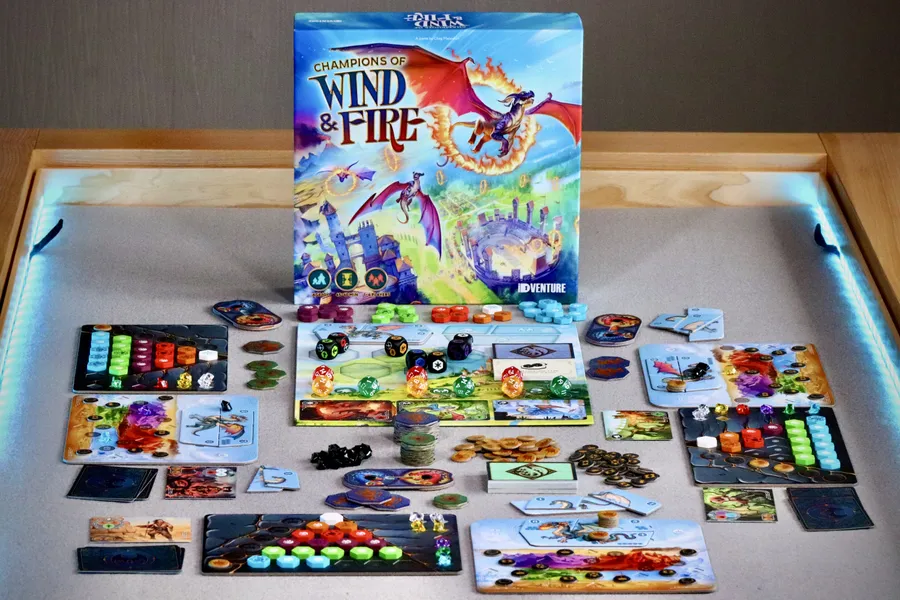 Welcome to the Champions of Wind & Fire, the world’s first dragon-building board game! Upgrade and train your dragon, gather magical elements, and compete to win the tournaments!