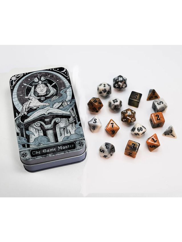 Nestled within this tin are 16 dice. That includes your primary set in one color, a secondary set in another for multiple enemies attacking at once, and two special d20s for when every creature on the battle map needs to ROLL INISH!