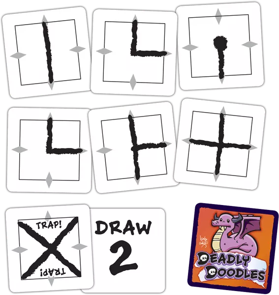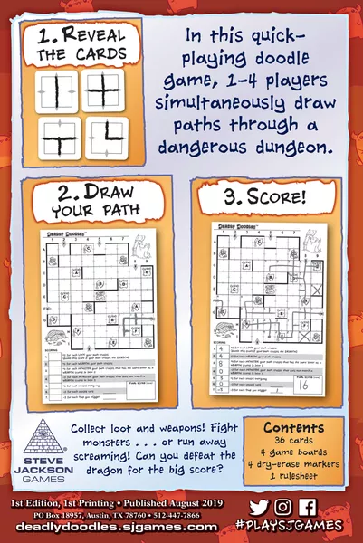 In Deadly Doodles, 1-4 players simultaneously draw paths through a dangerous dungeon. Draw cards, draw a path through your dungeon, and rack up points! Collect loot and fight monsters...or run away screaming! Can you defeat the dragon for the big score?