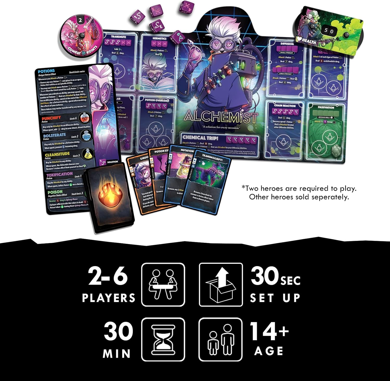 A heart-pumping, fast-playing game of skilled card play and dice manipulation. The game is played over a series of rounds where you will be rolling your hero's dice up to 3 times. You will use the combination of dice symbols or numbers to activate your hero's abilities to attack your opponent(s).