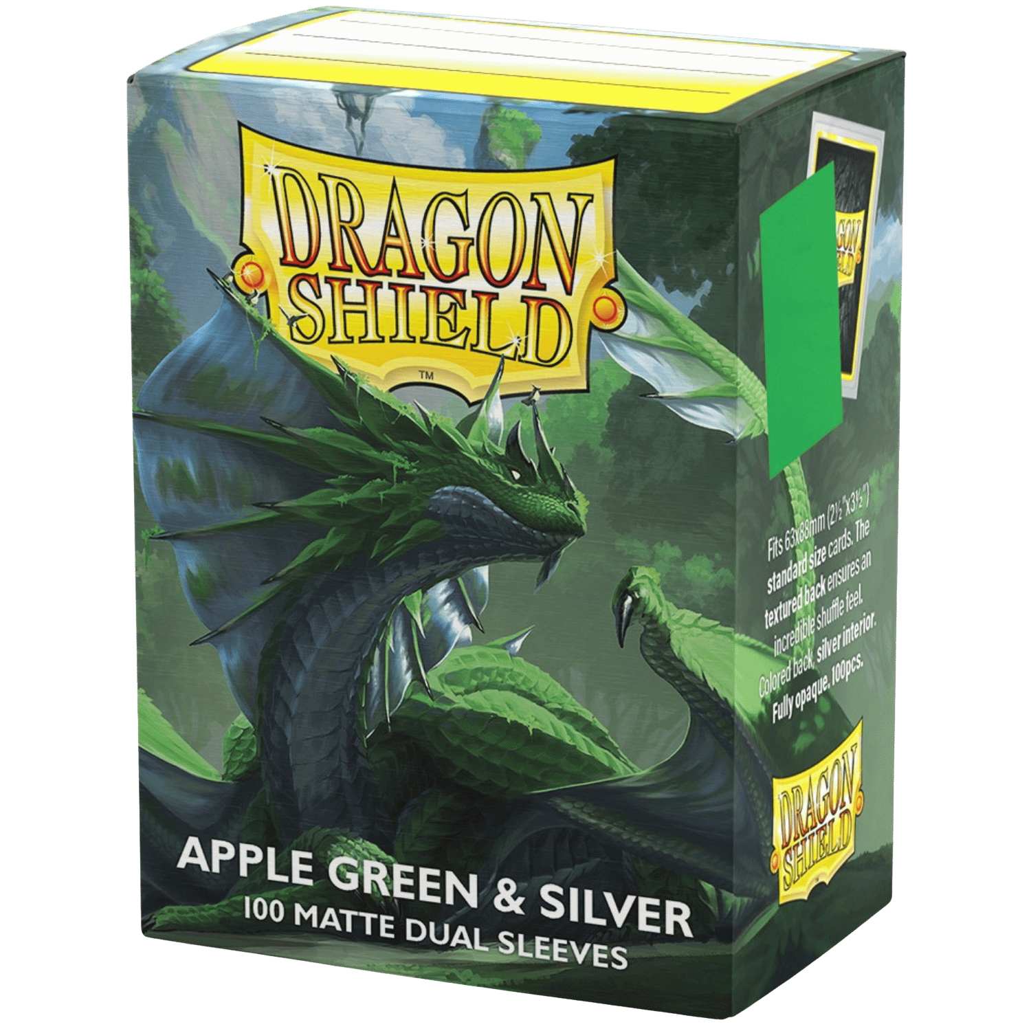 Apple Green & Silver sleeves feature a bright green back and a silver interior. A great choice for grass types! The next evolution in Dragon Shield's Matte Dual sleeves, featuring brilliant bright backs with an elegant silver interior.