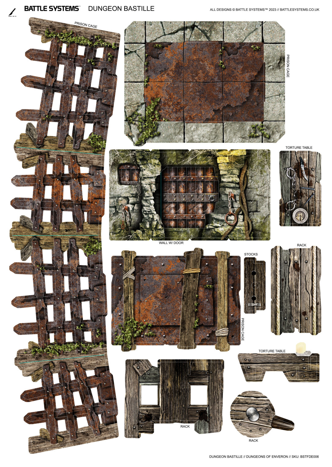 This pack expands your dungeon with prison and torture chamber themed terrain, from walls and doors fitted with iron bars, to alarm bells, chains, prison bunks, and a torture chamber complete with a rack. It works in conjunction with the rest of the Battle Systems Dungeon range. The terrain is supplied flat-packed on high-quality, high-density card, printed in full colour on both sides, so no painting required! The terrain requires assembly, and some smaller parts will require glue.