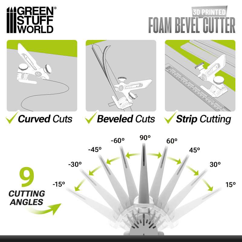 This particular model is compatible with any standard 18 mm snap-off blade and features preset cutting angles at −15°, −30°, −45°, −60°, 90°, and positive 15°, 30°, 45°, and 60°. It supports both left- and right-handed users thanks to its symmetrical ergonomic design. Whether you're assembling armor or building layered diorama bases, a foam bevel cutter simplifies the process and ensures clean, professional results.