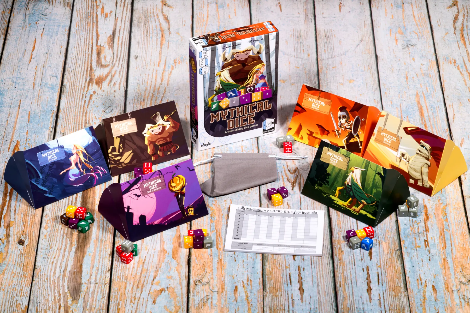 The game includes seven types of dice: minotaurs, griffins, mermaids, and four types of number dice. The game lasts 6-8 hands depending on the number of players, and in each round each player draws a number of dice from the bag equal to the current hand, e.g., five dice for the fifth hand, then places them behind their screen, keeping these dice a secret from all. After getting their dice, each player simultaneously bids the number of tricks they think they'll claim during the round by putting out fingers on their hand. Record these bids on the scoresheet.
