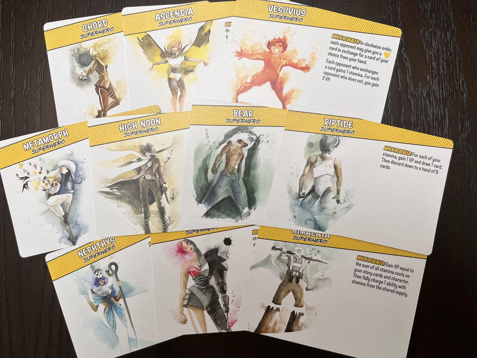 Origin Story is a 1-5 player competitive tableau-building, trick-taking game played over 5 rounds. Each round represents a chapter in your development and grants a new card to add to your player mat. Charge your cards and use their abilities to score more points than your opponents.
