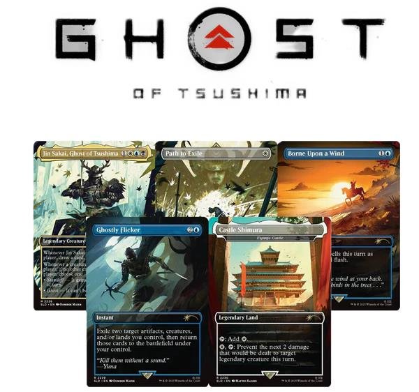 Sucker Punch Productions and Wizards of The Coast capture the dual identity of Jin Sakai in the Ghost of Tsushima Secret Lair pack. In battle, every strike for Jin is a choice: the honorable standoff that cuts down foes with precision, or the unrelenting stealth of the Ghost, striking unseen.