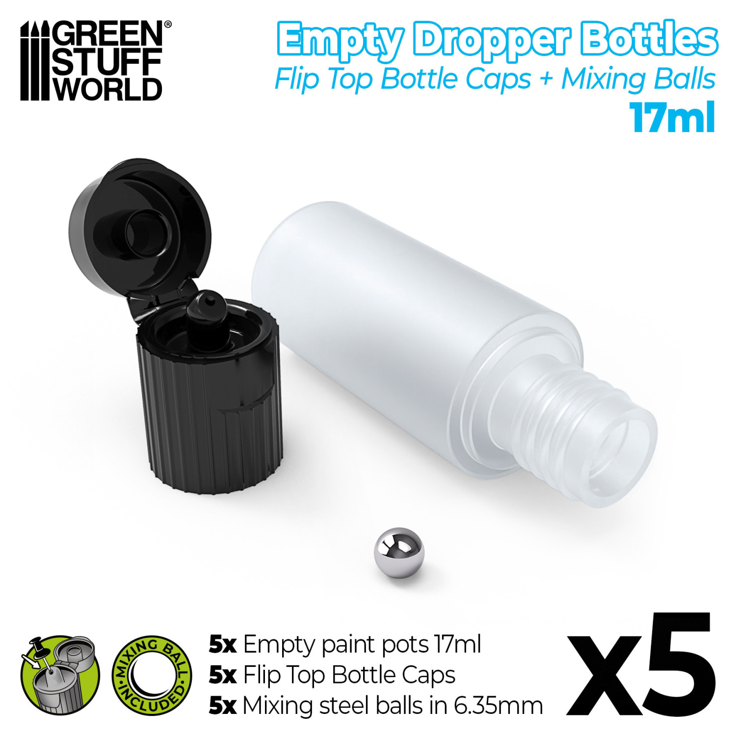 Set of spare empty jars or paint pots in 17mL with mixing stell balls and dropper.