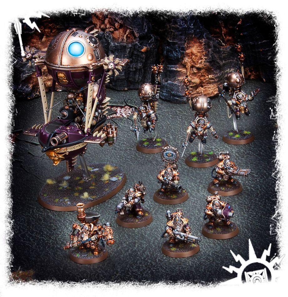 A militaristic, mercantile society detached completely from the other branches of duardin that populate the Mortal Realms, the Kharadron Overlords treat war and trade as much the same thing – a means to amass wealth and they excel at both. More than anything, they seek aether-gold – this lighter-than-air element is their society’s lifeblood, holding their cities aloft, fueling their ships and powering their elaborate armour. Great sky-fleets of warships descend from dozens of sky-ports when a rich seam is discovered; the Kharadron Overlords will fight bitterly to accrue this vital substance, and the status it brings.