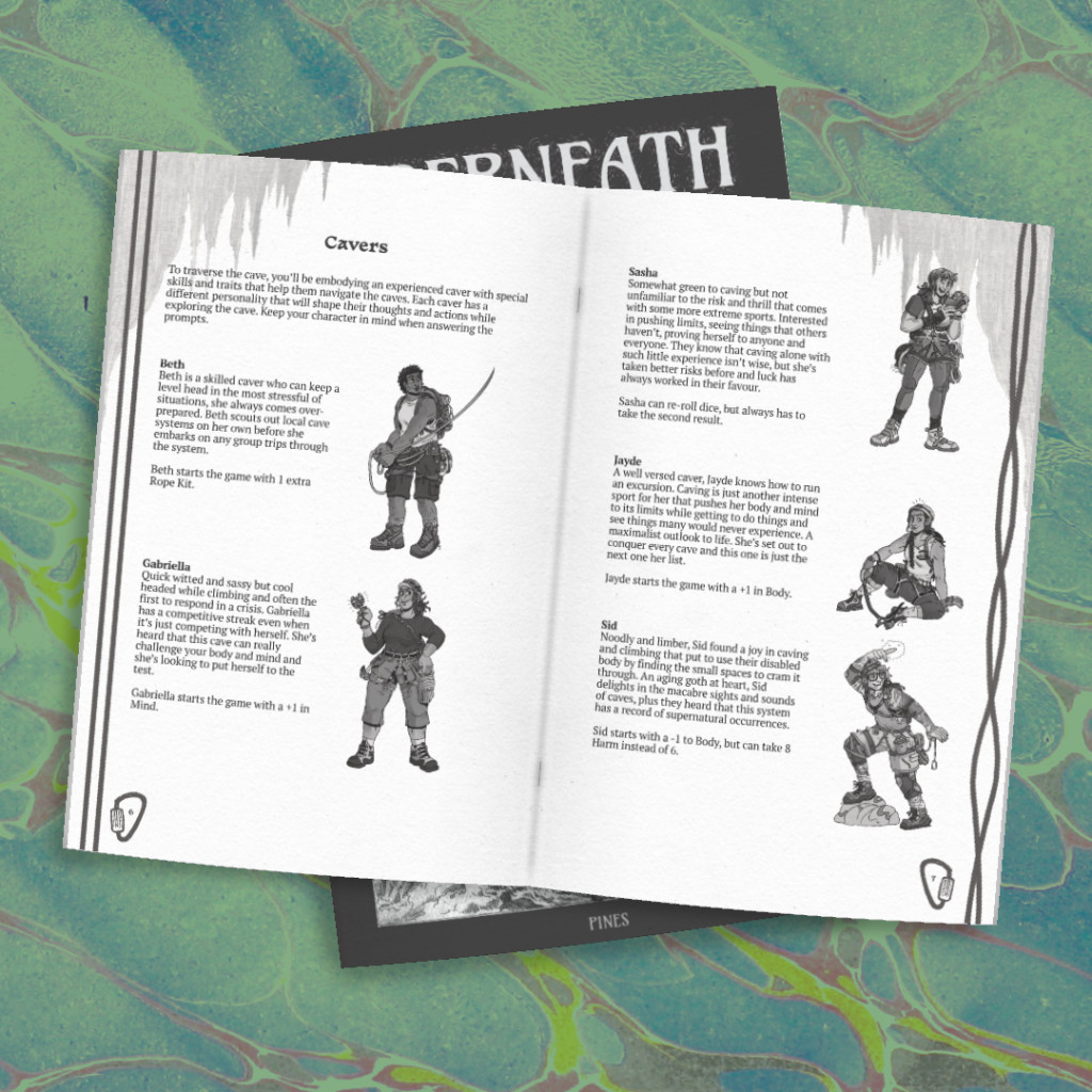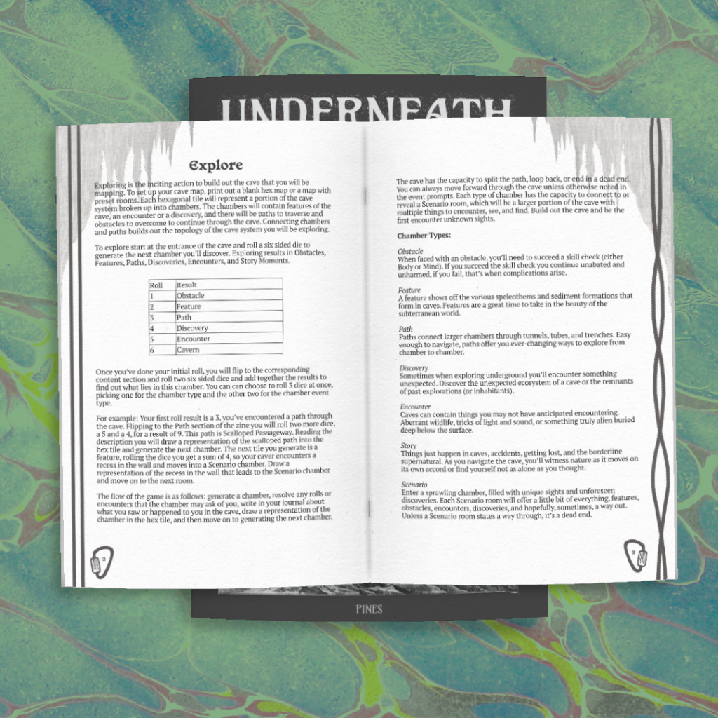 Underneath is a solo game of map-making and journalling that you will play between the game book, your excursion journal, a map, and a pair of six-sided dice propelling your character through this cave system.
