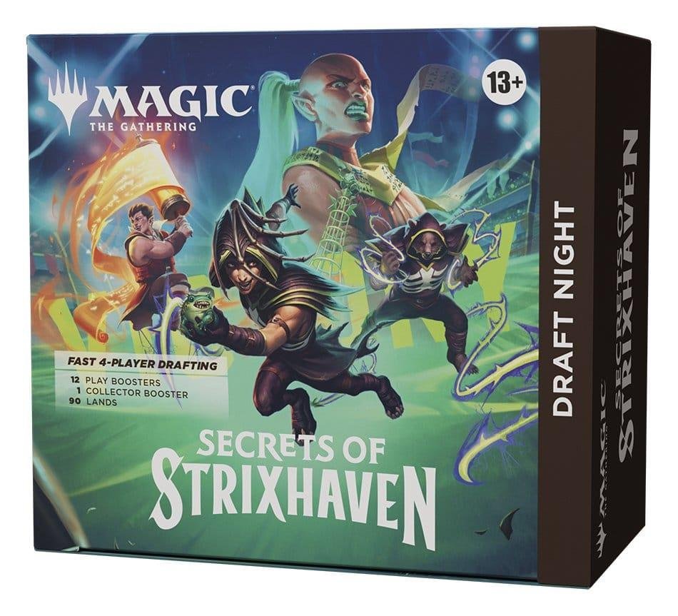 Είναι ένα πάρτι ντραφτ σε κουτί! Το Draft Night είναι το αυτόνομο κιτ για τη διοργάνωση ενός Pick-Two Draft για τέσσερις παίκτες. Στεφανώστε τον νικητή με το ενσωματωμένο Secrets of Strixhaven Collector Booster (ή μπορείτε να το κρατήσετε για τον εαυτό σας, δεν θα κρίνουμε). Περιέχει 12 Play Boosters, 1 Collector Booster, 90 Basic Land κάρτες και 10 double-sided token κάρτες.