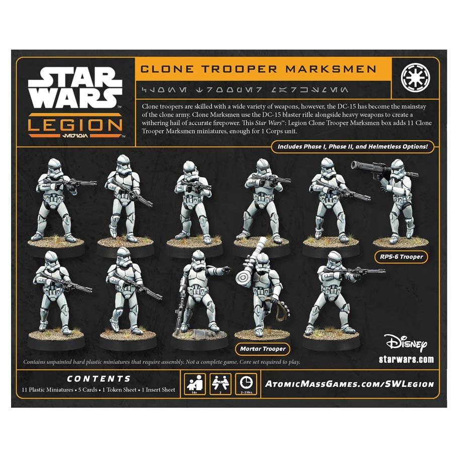 Οι κλώνοι στρατιώτες είναι επιδέξιοι με μια μεγάλη ποικιλία όπλων, ωστόσο, το DC-15 έχει γίνει το βασικό στήριγμα του στρατού των κλώνων. Οι κλώνοι σκοπευτές χρησιμοποιούν το blaster rifle DC-15 μαζί με βαριά όπλα για να δημιουργήσουν ένα καταιγιστικό καταιγισμό ακριβούς πυρός. Αυτό το κουτί Star Wars™: Legion Clone Trooper Marksmen προσθέτει 11 μινιατούρες κλώνων σκοπευτών στρατιωτών, αρκετές για 1 μονάδα Σώματος. Αυτή είναι μια εξαιρετική επέκταση επόμενου βήματος για παίκτες που θέλουν να χτίσουν τη Γαλαξιακή τους Δημοκρατία.