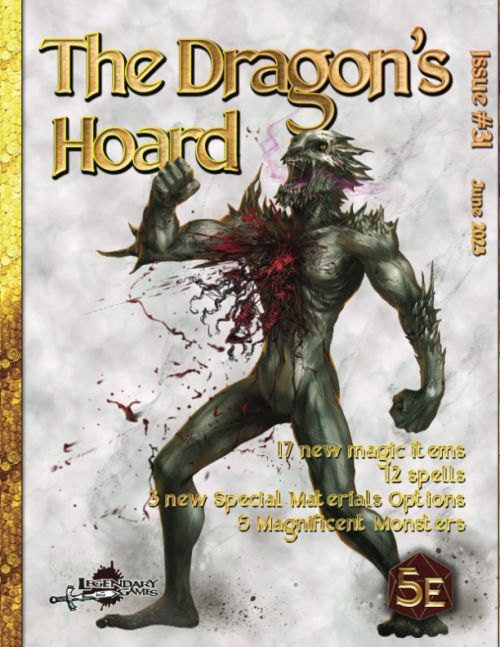 Το The Dragon's Hoard είναι μια μηνιαία ανθολογία μαγικών αντικειμένων, ξορκιών, τεράτων και άλλων για την καμπάνια της 5ης Έκδοσης! Κάθε τεύχος του The Dragon's Hoard παίρνει κάθε νέο μαγικό αντικείμενο, ξόρκι, τέρας ή άλλο νέο περιεχόμενο κανόνων από το συνεχιζόμενο Legendary Loot Patreon και σας το παρουσιάζει, με δεκάδες νέα στοιχεία όμορφα εικονογραφημένα και έτοιμα να τα εξαπολύσετε στους παίκτες σας! Στα χαρακτηριστικά αυτού του μήνα θα βρείτε: